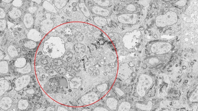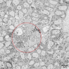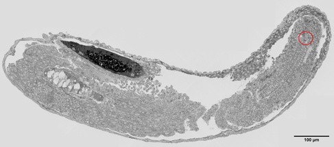 Following the ablation in a confocal laser microscope, the zebrafish embryos were processed for electron microscopy, sectioned and viewed by SEM blockface imaging with the aim to find the ablated areas.