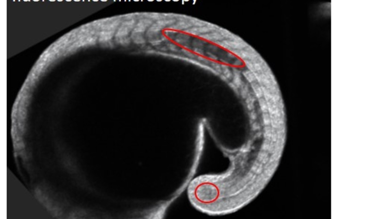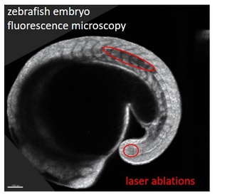 Confocal image of a zebrafish embryo, the two ablations, a large area in the notochord and a small area in the tail bud, are highlighted in red.