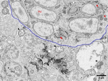 The blue line denotes the border between the ablated/damaged tissue area (bottom) and the normal, undamaged tissue (top). The red markings show undamaged, oval nuclei (nu) with a ‘tight’ nuclear membrane, elongated mitochondria with a dark matrix (arrowheads) and Golgi membrane stacks (arrow). In contrast, the black markings in the ablated area show round nuclei with condensed chromatin and dilated nuclear membranes and the mitochondria have become enlarged and rounded with dilated cristae and a pale matrix (arrowheads). The normal cellular structure is highly disrupted and dark-stained areas of collapsed cell debris (arrow) are apparent.