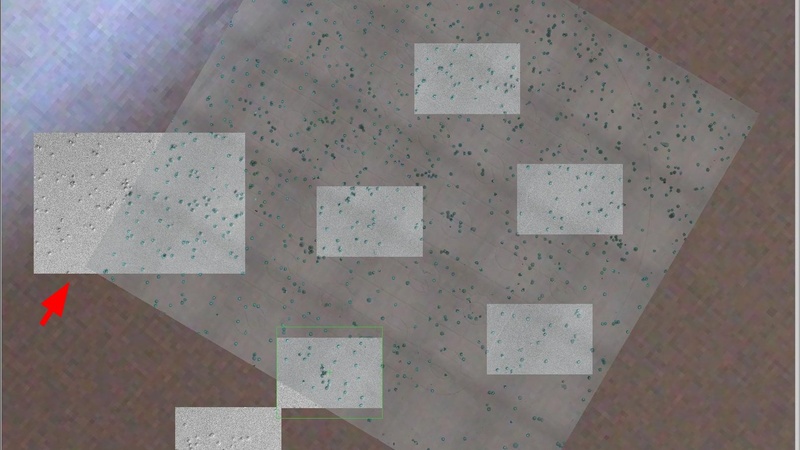 After linking two corresponding marker positions, the MAPS software aligns the imported tiled image with the SEM microscope stage. Clicking on any cell/marker in the tiled image will now drive the SEM stage to that location.