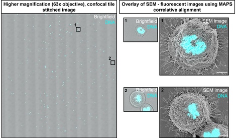 Left: HeLa cells stained with DAPI - tiled overview image with marker positions taken in a Leica SP8 confocal microscope, CAIC. Right: DAPI-SE/SEM overlays of M-phase cells at defined marker positions, scale bar is 10 um.