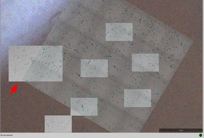 MAPS software after alignment: the imported tiled image (large grey square) is now rotated to align with the SEM sample on the microscope stage. The larger SEM preview image on the left (red arrow) overlaid over the imported tile image shows the correct alignment.
