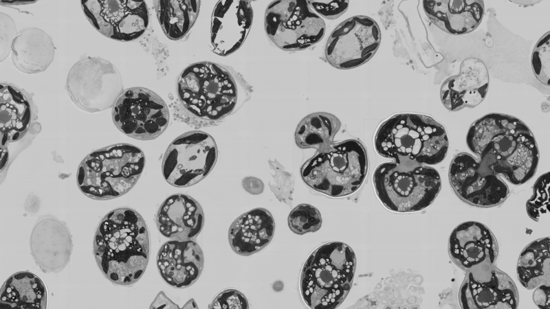 The advantages of SEM blockface imaging over TEM are apparent: it is possible to view areas much larger than would even fit onto a standard TEM grid and the specimen is free of grid bars, which always obscure part of the sample in TEM; it allows to gain an overview of a sample not possible by TEM and makes it easier to find a particular area of interest. However, the useful magnification of blockface imaging is presently limited to about 8,000 – 10,000x. The FEI MAPS software on our Verios 460 SEM can be set up for acquisition of image tiles in an automated fashion producing large specimen maps, which can be zoomed at any region of interest.