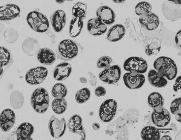 Map of a culture of green algae (Cosmarium subtumidum) revealing the morphology of the pyrenoids, the main actors of the algal carbon concentrating mechanism. Pyrenoids improve the efficiency of photosynthesis by delivering carbon dioxide to RuBisCo, an enzyme concentrated at the heart of this micro-compartment. Surrounded by a typical starch sheath, the pyrenoid is pervaded by an intricate network of microtubules (Myriam Goudet, Howard Griffiths, Physiological Ecology Group, Dept. of Plant Sciences, University of Cambridge).