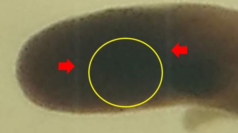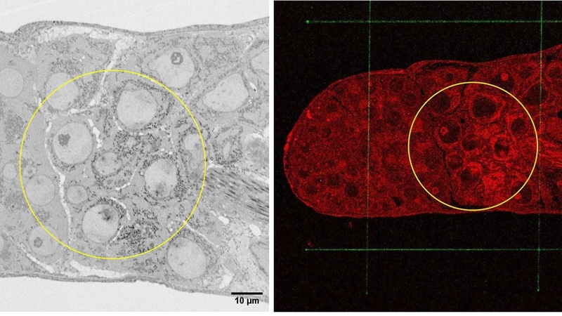 Left: SEM blockface image of the tip of the Drosophila testis at higher magnification. The area of DAB precipitation is recognizable by the darker nuclear and mitochondrial staining. Right: Overlay of the SEM backscatter image (red) with the SE-image of the line scanning marks (green) after marking. The DAB region is denoted by the yellow circle.