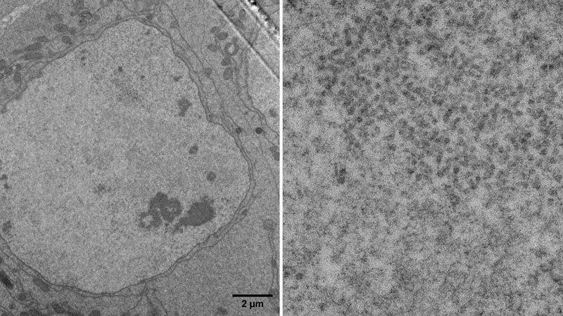 In a study conducted by Stefan Koestler (now University of Birmingham) and Rob White (Dept. of PDN, Emeritus) Drosophila testes were labelled in a defined area with a DAB (diaminobenzidine) precipitate using the laser of a confocal microscope (method modified from https://doi.org/10.1126/science.aag002). After subsequent processing of the testes for EM, the 'SEM-to-TEM' technique was used to find and isolate the DAB-labelled area and to prepare sections for TEM tomography studies.