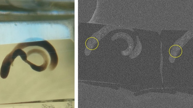 In the ‘SEM-to-TEM technique’, a whole resin block is mounted on a SEM stub. After sectioning into the sample, the block surface is imaged in the SEM. This makes it very easy to get an overview over a larger piece of tissue and to locate a small, specific region of interest. The SEM line scan function can then be used to mark this ROI on the resin, which in turn can guide the trimming of the block in the ultramicrotome. Ultrathin sections of the specific ROI can then be cut and used for TEM imaging at resolutions much higher than those possible by SEM blockface imaging.