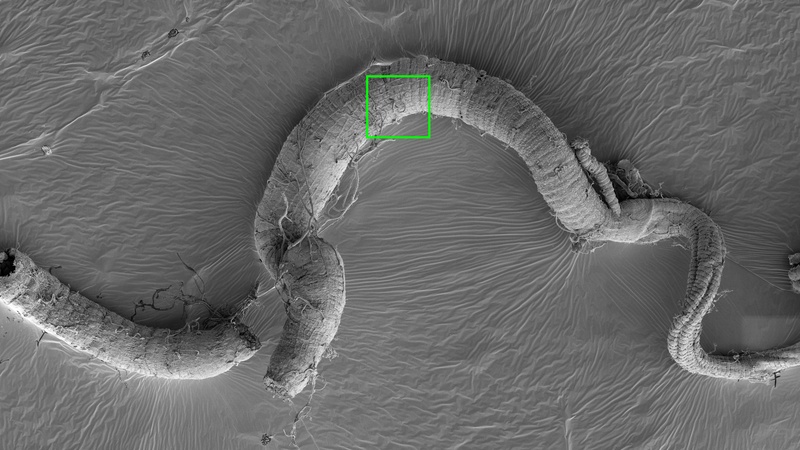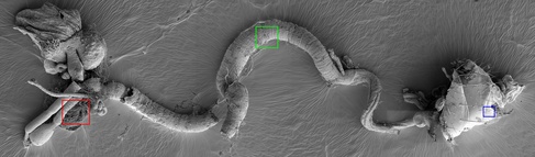 Drosophila intestinal tract (Golnar Kohlagar, Department of Physiology, Development and Neuroscience, Cambridge). The top overview image is a stitched map created using FEI MAPS software. Successive images are increasingly zooming in on the structures denoted by the coloured squares.