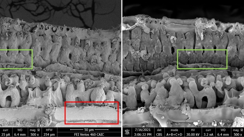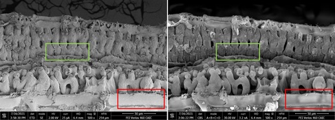Partial fracture of freeze-dried wheat leaf. On the left, imaged in SE-mode using the ETD detector at 2 keV and 25 pA detailing mostly the surface topography of the sample. On the right, the leaf was imaged in BSc-mode using the CBS detector at 30 keV and 3.2 nA reaching more structures in the depth of the sample, e.g. intracellular chloroplasts (green square) or penetrating the surface wax layer (red square) to reveal the underlying epidermis cells (Karin Mueller, CAIC).