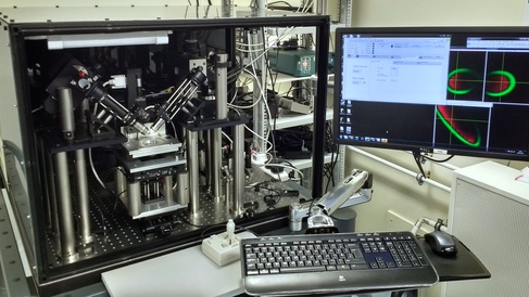 Using a commercial Omicron laser combiner as well as a multi-photon laser together with a motorised filter wheel it is possible to excite and detect a number of fluorophores and therefore allow flexible imaging.